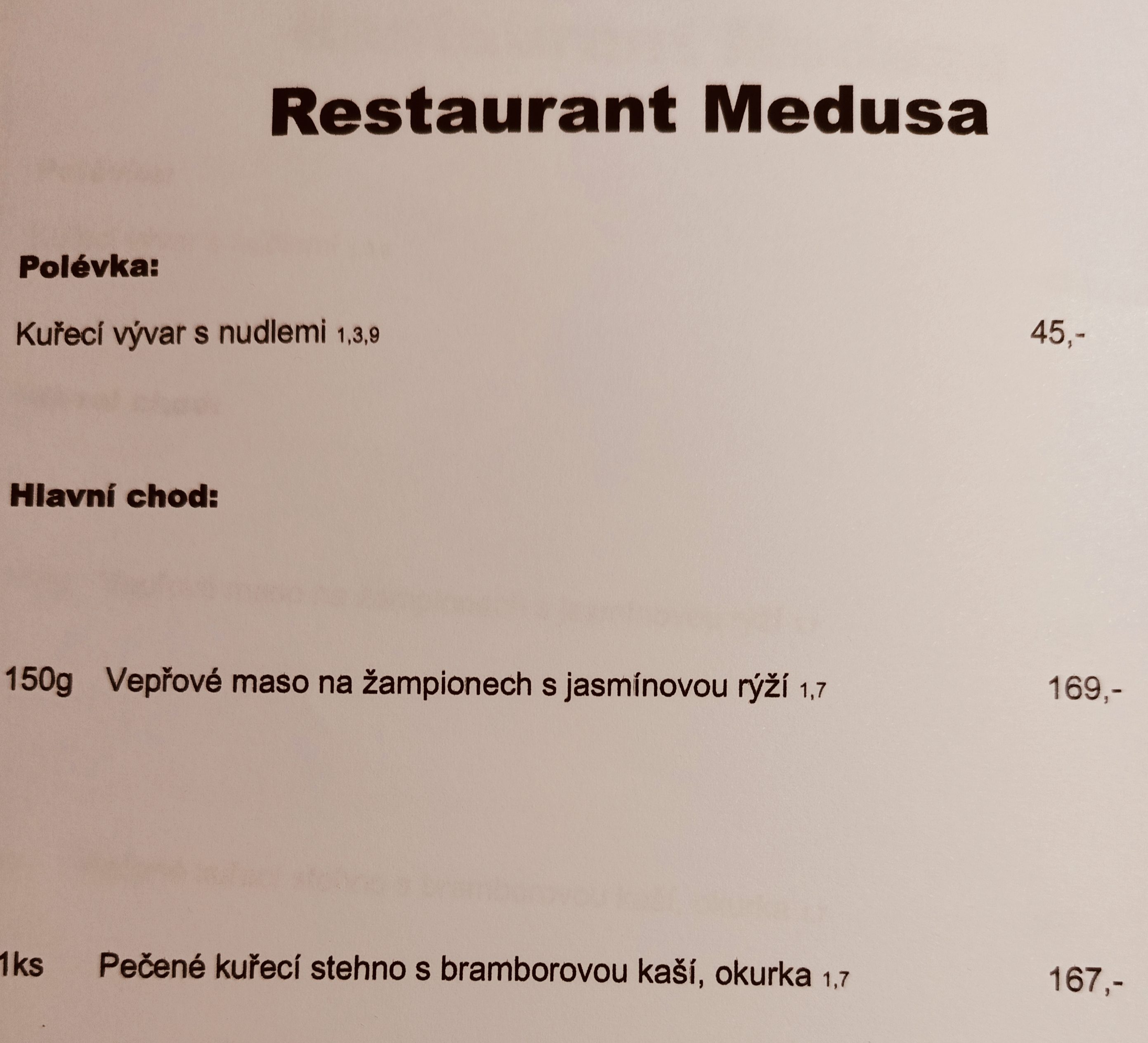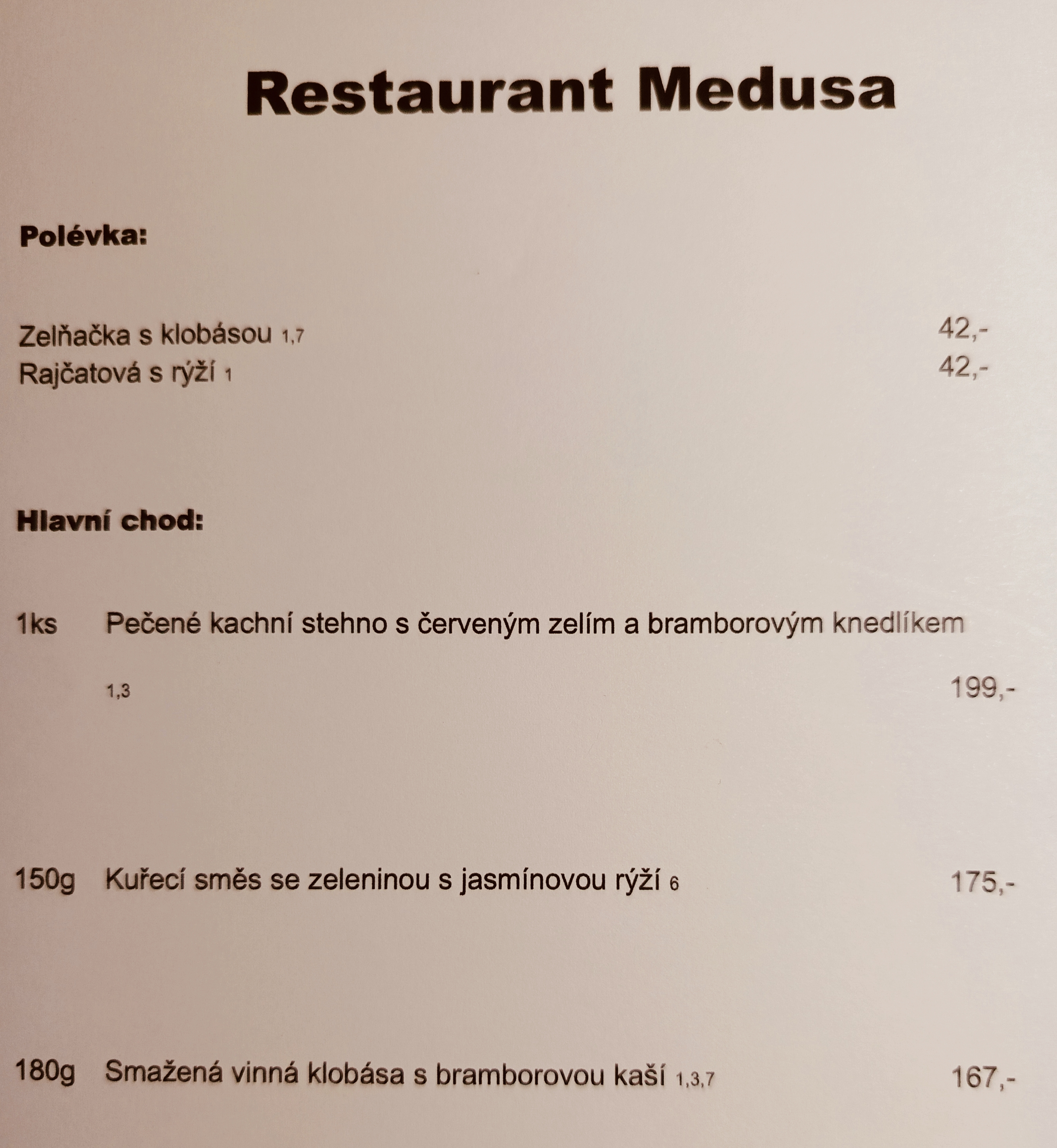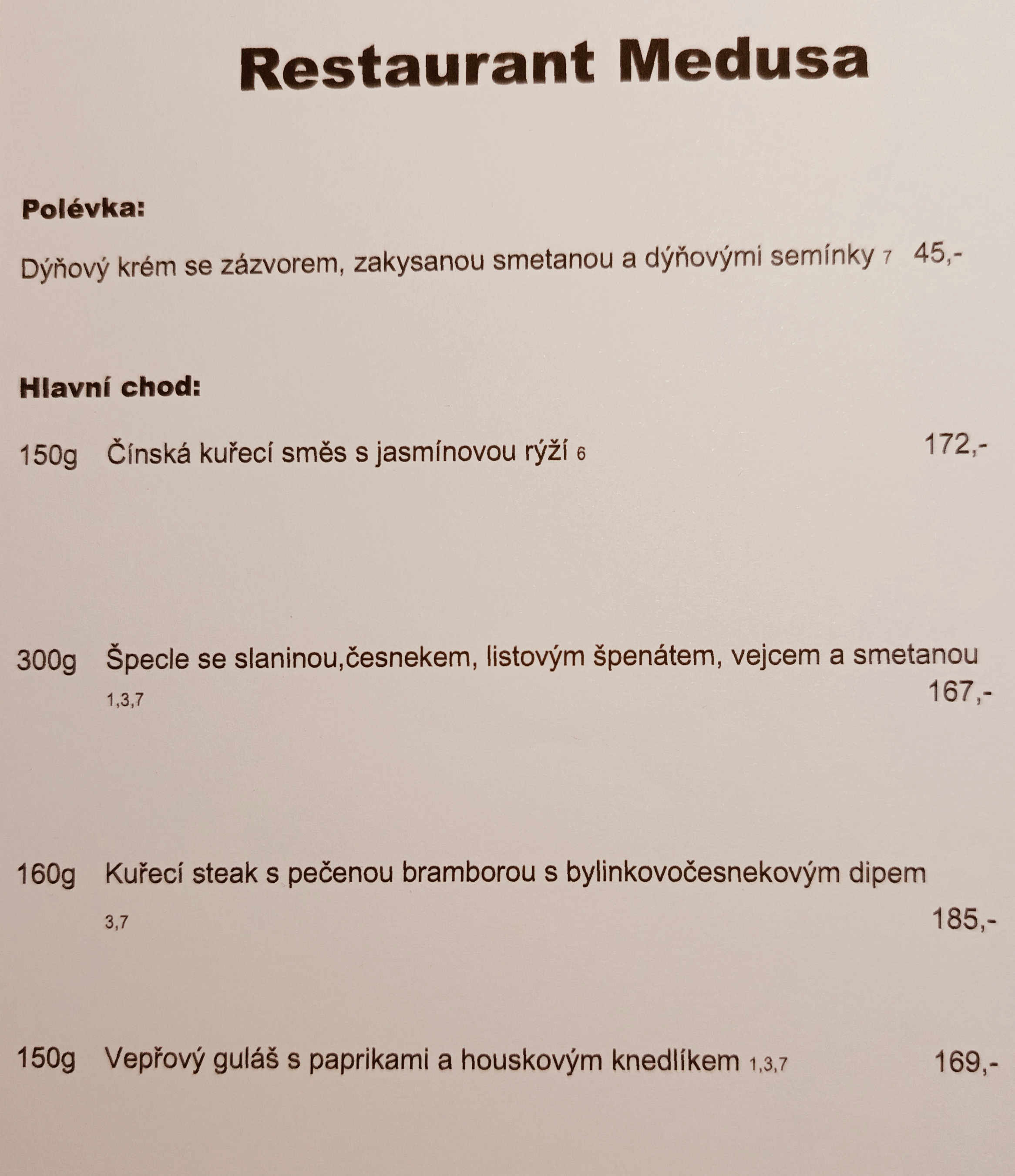 "Krásné prostředí a moc milá obsluha...!!! Jídlo vynikající a oceňuji i možnost objednání dětské porce pro dospělého - jím málo a normální porce by pro mně byla moc. Restauraci Meduza všem doporučuji...!!!"