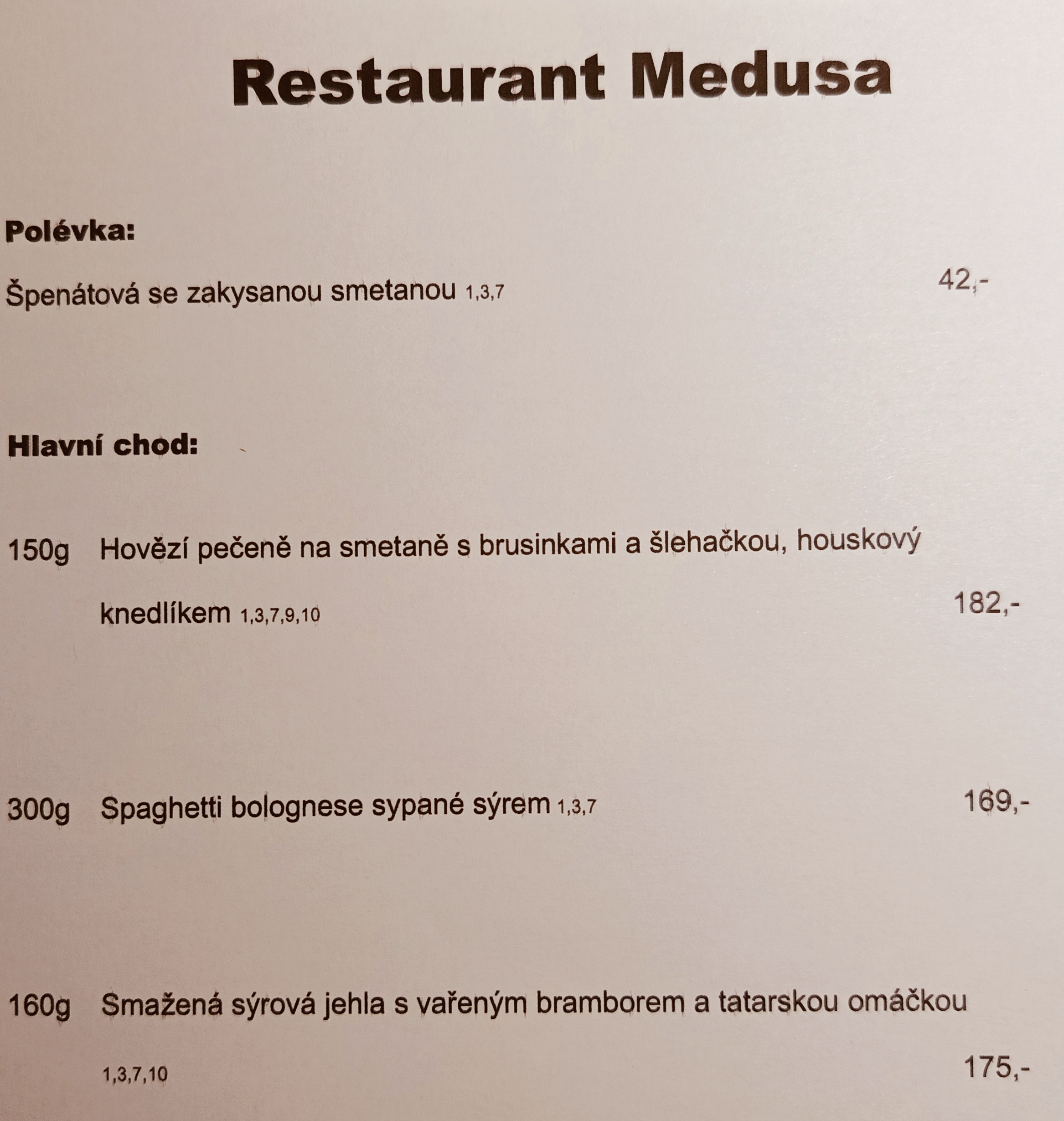 "Krásné prostředí a moc milá obsluha...!!! Jídlo vynikající a oceňuji i možnost objednání dětské porce pro dospělého - jím málo a normální porce by pro mně byla moc. Restauraci Meduza všem doporučuji...!!!"